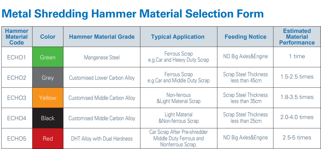 Echo Machinery is excited to introduce our materials options for the metal shredding hammers, designed to meet the unique demands of your work. Please find below 2 pictures.